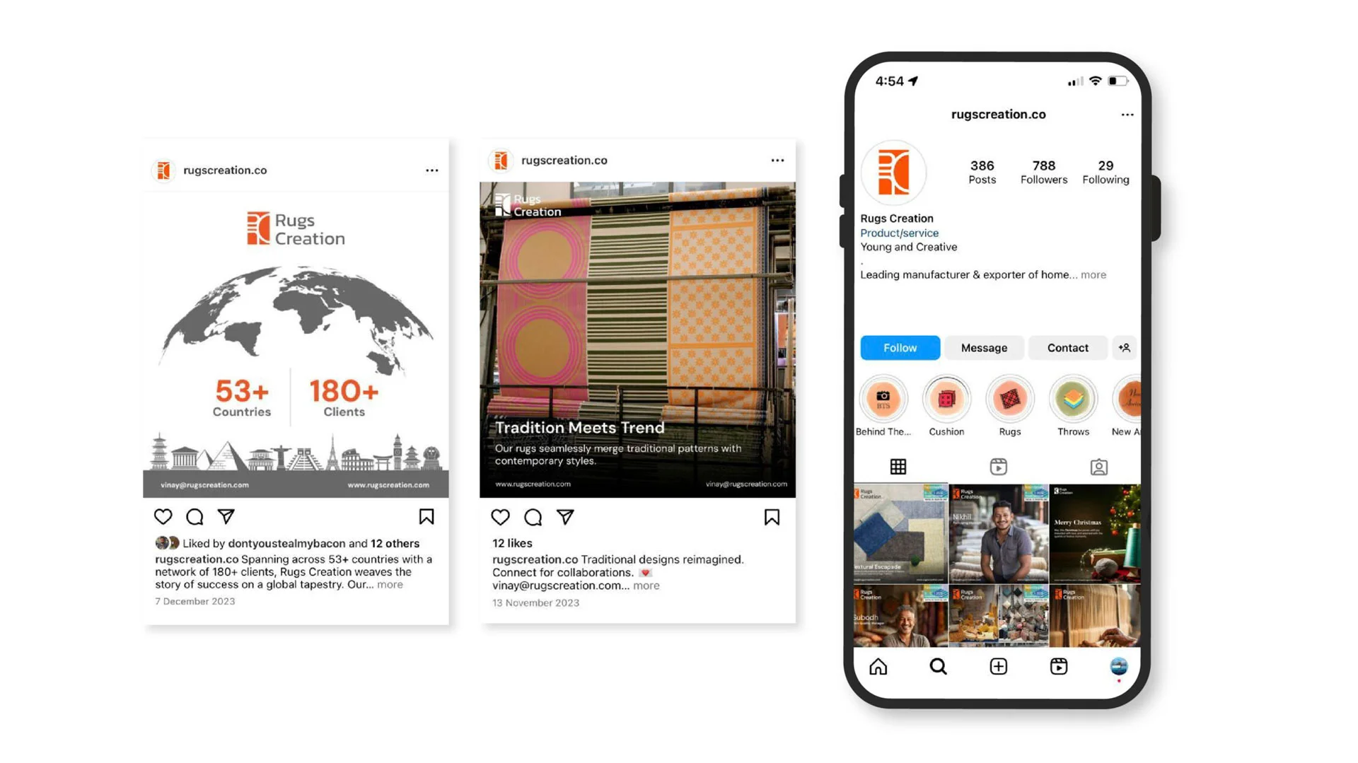 The result was a cohesive and modern brand presentation that celebrated Rugs Creation’s journey from Panipat’s weaving heritage to a globally recognized home furnishing manufacturer. The new identity and visual content elevated their storytelling, built stronger trust among international clients, and positioned the brand as a benchmark in craftsmanship and innovation.